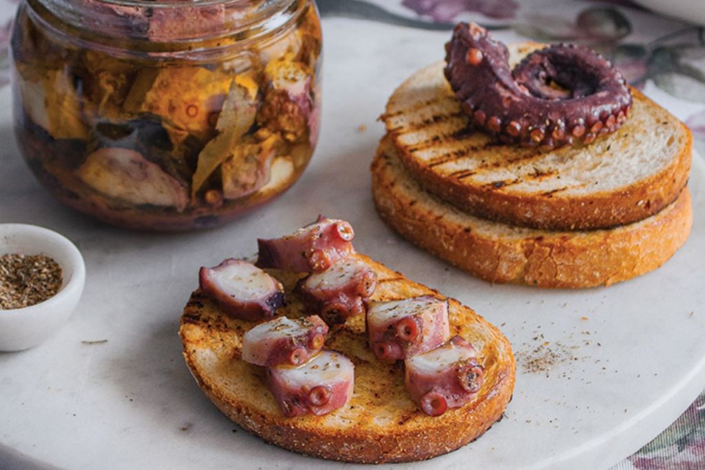 - Όσο είναι ζεστό το χταπόδι, το πασπαλίζουμε με ρίγανη. Μόλις κρυώσει αρκετά, ώστε να μπορούμε να το πιάσουμε, το κόβουμε με ένα μαχαίρι σε μεγάλες μπουκιές. Το μεταφέρουμε σε γυάλινο σκεύος και το περιχύνουμε με τους ζωμούς του. Ανακατεύουμε με προσοχή και το διατηρούμε στο ψυγείο καλά σκεπασμένο για πολλές εβδομάδες.