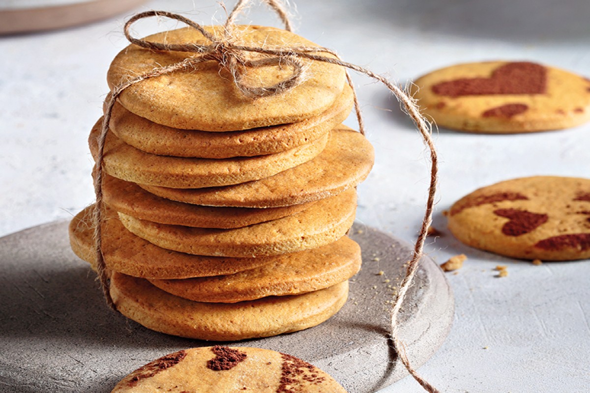 - Παίρνουμε μικρές ποσότητες ζύμης και τις ανοίγουμε με τον πλάστη σε φύλλο πάχους 1/2 εκ. Χρησιμοποιώντας ένα κουπ πατ με ό,τι σχέδιο και σχήμα θέλουμε, κόβουμε μπισκότα. Τα μεταφέρουμε μαζί με το κουπ πατ στο ταψί, πιέζοντας τη ζύμη να βγει και αραδιάζοντας το ένα δίπλα στο άλλο σε μικρή απόσταση.