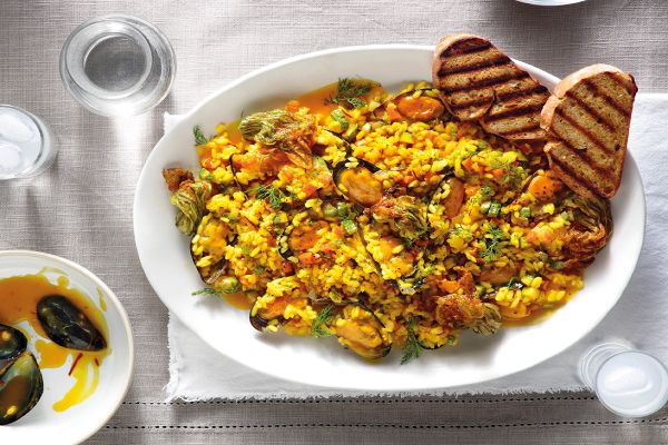 Ζεσταίνουμε σε μια κατσαρόλα το ελαιόλαδο και σοτάρουμε το κρεμμύδι και το σκόρδο. Προσθέτουμε τα καρότα, τα κολοκυθάκια και τα μύδια. Ανακατεύουμε και σβήνουμε με το ούζο και το κρασί.