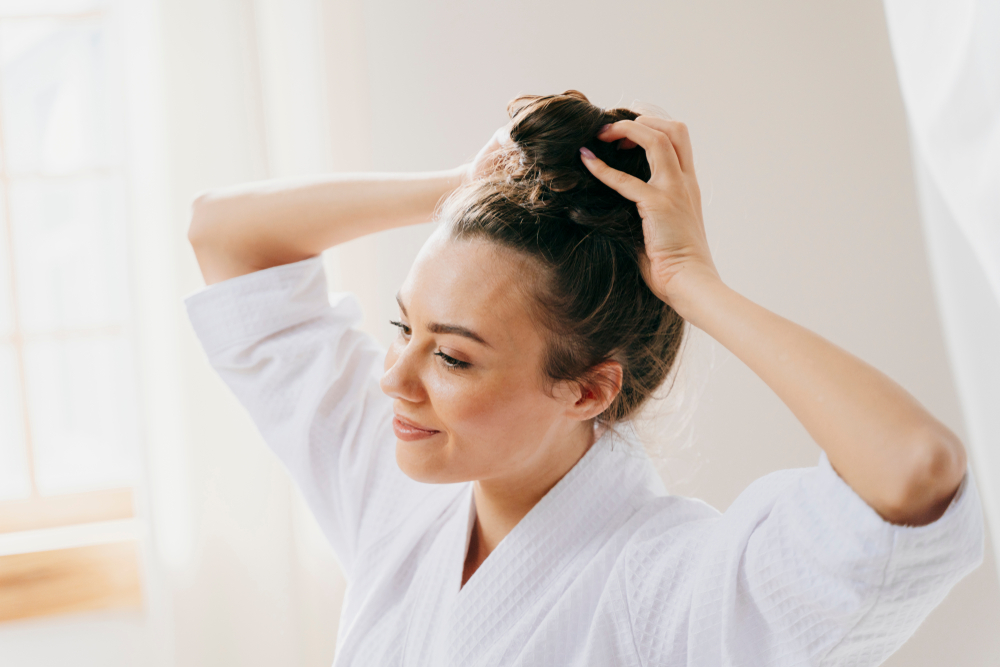 Φέρτε το κεφάλι σας προς τα εμπρός για να αιματωθεί όλο το τριχωτό της κεφαλής σας -εναλλακτικά, ξαπλώστε στο κρεβάτι σας και αφήστε το κεφάλι σας να κρέμεται στο πλάι του κρεβατιού, χωρίς να ακουμπάει κάπου. Έπειτα, ακολουθήστε τα τέσσερα παρακάτω βήματα για ένα γρήγορο αλλά αποτελεσματικό μασάζ στο τριχωτό, από τον κορυφαίο expert Christophe Robin:
