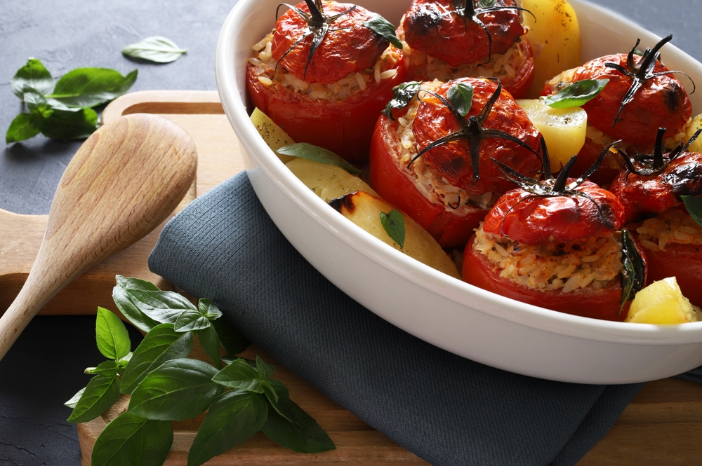 Στη συνέχεια, σε ένα μπολ ρίχνετε τις ντομάτες τριμμένες και το χυμό ντομάτας, προσθέτετε το υπόλοιπο ελαιόλαδο, αλάτι, πιπέρι ανακατεύετε καλά και περιχύνετε τα γεμιστά λαχανικά. Βάζετε το φαγητό σε προθερμασμένο φούρνο και το αφήνετε να σιγοψηθεί μέχρι να ροδίσουν τα λαχανικά.
