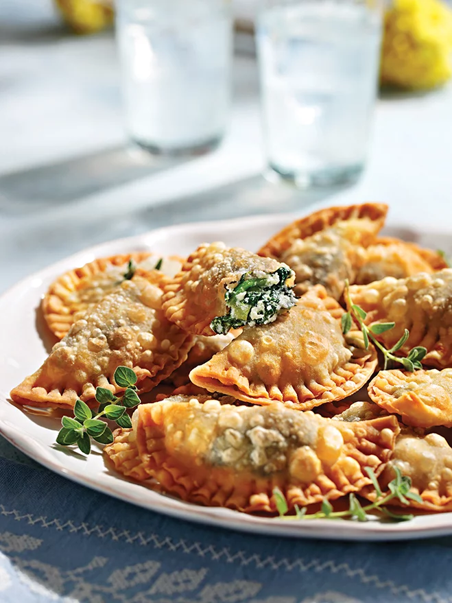 - Χωρίζουμε τη ζύμη σε τέσσερα μέρη και σε αλευρωμένη επιφάνεια ανοίγουμε το καθένα σε φύλλο. Κόβουμε δίσκους ζύμης, βάζουμε στη μια τους άκρη λίγη γέμιση και κλείνουμε σε μισοφέγγαρα.