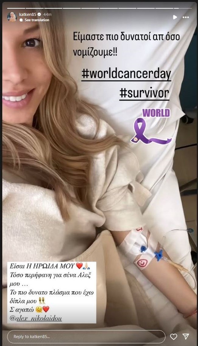 Η Αλεξάνδρα Νικολαΐδου τον Φεβρουάριο του 2025, την Παγκόσμια Ημέρα Κατά του Καρκίνου είχε μιλήσει δημόσια για τον αγώνα που έδινε για την υγεία της. «Είμαστε πιο δυνατοί απ’ όσο νομίζουμε», είχε γράψει σε story της. Για να απαντήσει αμέσως η καλή της φίλη Κατερίνα Καινούργιου αναδημοσιεύοντας τη φωτογραφία της, προσθέτοντας: «Είσαι η ηρωίδα μου. Τόσο περήφανη για σένα Άλεξ μου. Το πιο δυνατό πλάσμα που έχω δίπλα μου. Σ’ αγαπώ».