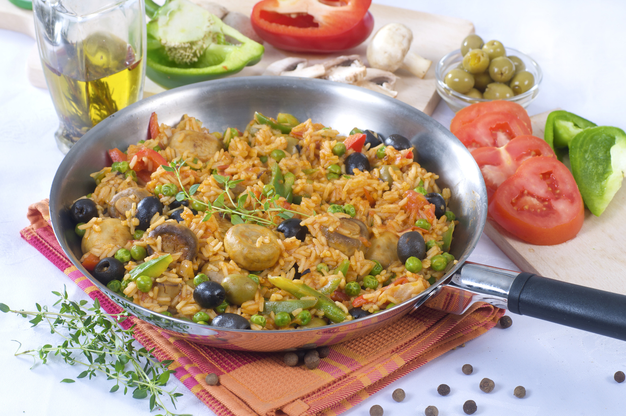 Προσθέστε τις αγκινάρες, τις πιπεριές και τις ελιές. Ανακατέψτε καλά, χαμηλώστε τη φωτιά στο ελάχιστο και αφήστε να μαγειρευτεί χωρίς ανακάτεμα για άλλα 15 λεπτά, μέχρι να απορροφηθεί το μεγαλύτερο μέρος του υγρού. Αν το ρύζι δεν είναι αρκετά τρυφερό, σκεπάστε το σκεύος με καπάκι και αφήστε το για ακόμη 5 λεπτά.