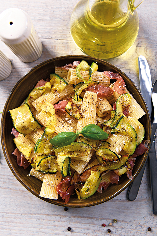 Πασπαλίζουμε με το τριμμένο τυρί (παρμεζάνα ή πεκορίνο) και φρεσκοτριμμένο πιπέρι και σερβίρουμε γαρνίροντας με φύλλα βασιλικού.