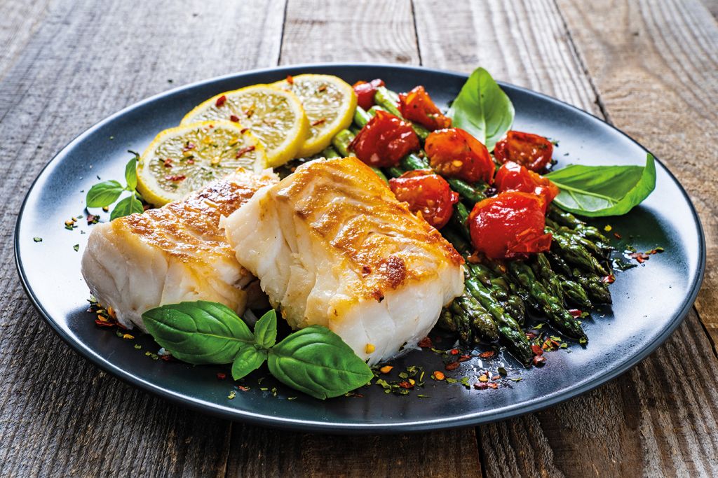Ψήνουμε το φαγητό σε προθερμασμένο φούρνο, στους 200°C, για περίπου 25 λεπτά, μέχρι να ψηθεί ο μπακαλιάρος (να ξεφλουδίζει εύκολα με το πιρούνι) και να μαλακώσουν τα σπαράγγια.