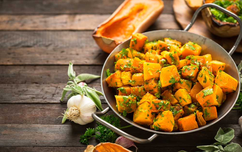 Ψήσε για περίπου 30 λεπτά, μέχρι η κολοκύθα να μαλακώσει και το καλαμπόκι να αρχίσει να παίρνει χρώμα.