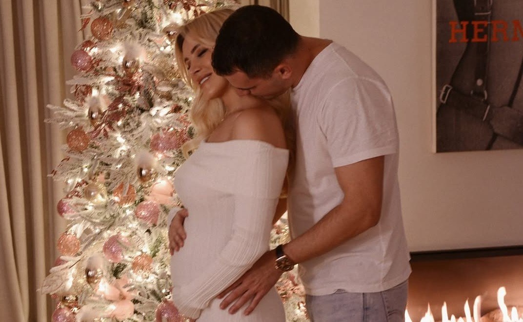 Ποζάροντας μπροστά από το λευκό χριστουγεννιάτικο δέντρο του σπιτιού του, το ζευγάρι δείχνει ιδιαιτέρως ευτυχισμένο, με τον σύντροφο της Κατερίνας Καινούργιου να την αγκαλιάζει τρυφερά, ακουμπώντας την στην κοιλιά και φιλώντας την στον λαιμό.