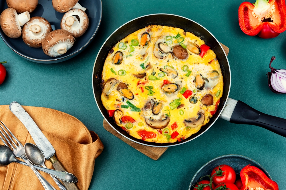 • Χτυπάμε τα αυγά σε ένα μπολ, αλατοπιπερώνουμε, και ρίχνουμε το μείγμα αυγών στο τηγάνι. Μαγειρεύουμε, τραβώντας απαλά τις άκρες της ομελέτας με μια σπάτουλα, έτσι ώστε το αυγό να γεμίζει τα κενά και να ψηθεί.