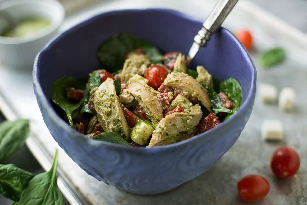 Μεταφέρετε το κοτόπουλο σε ένα πιάτο και αφήστε το να ξεκουραστεί. Προσθέστε τα λαχανικά στο σχαροτήγανο και μαγειρέψτε για 2–3 λεπτά από κάθε πλευρά, ή μέχρι να μαλακώσουν και να πάρουν ελαφρύ χρώμα. Επιστρέψτε τα στο μπολ, προσθέστε το πέστο και τη ρόκα και ανακατέψτε ελαφρά.