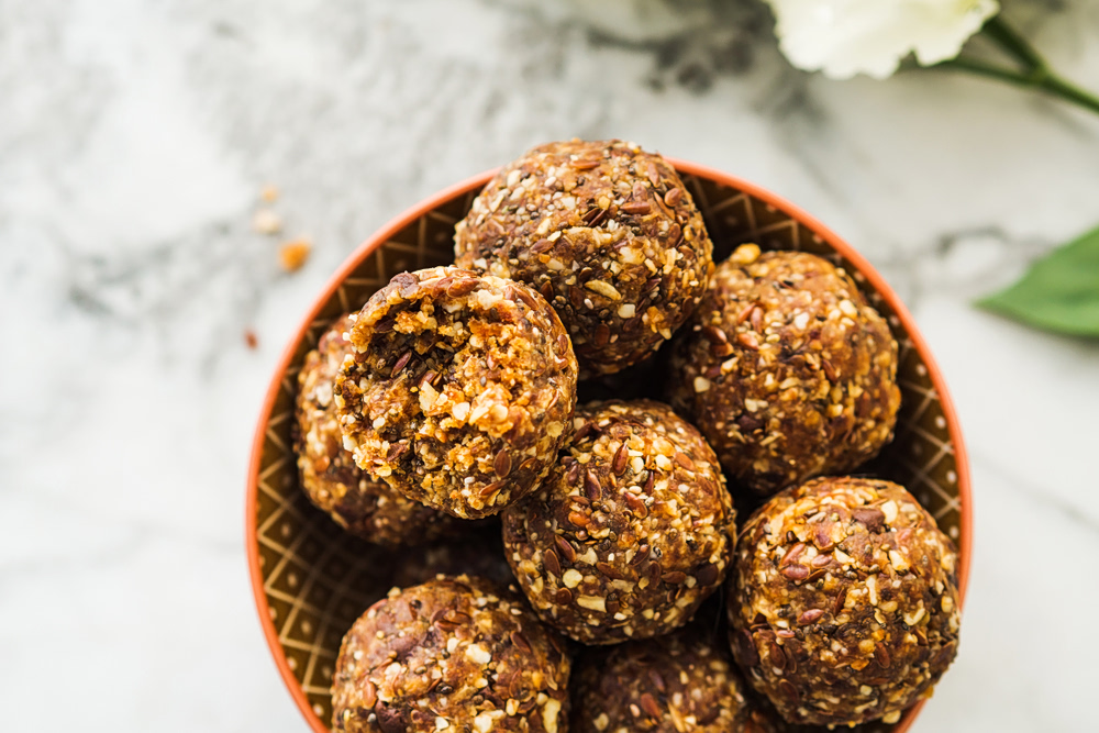 Ρίξτε τους υπόλοιπους σπόρους λιναριού σε ένα μικρό μπολ και πασπαλίστε τα τρουφάκια μέσα στους σπόρους για να τα καλύψετε.